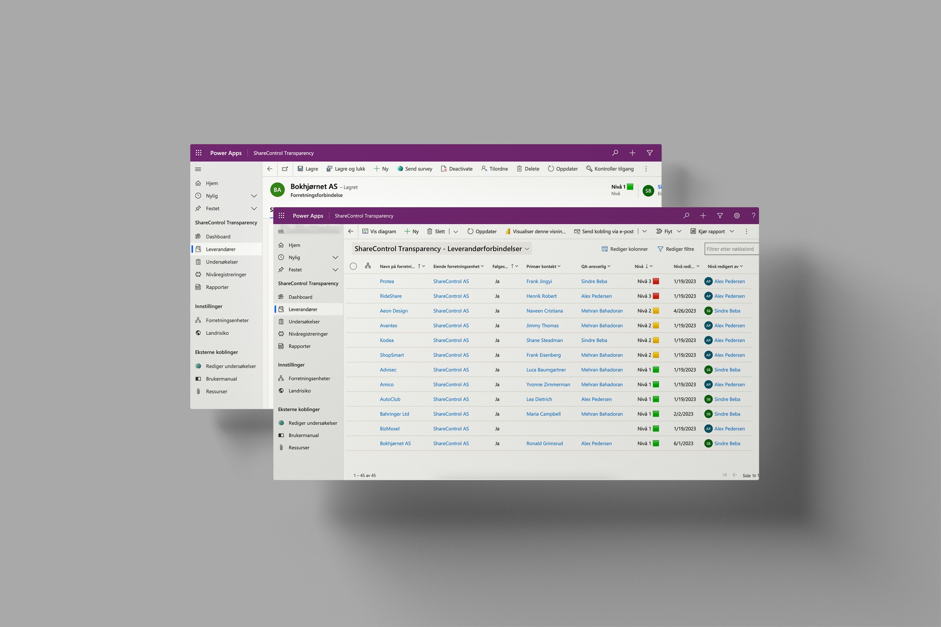 Med ShareControl Transparency får du et enkelt system til at håndtere overholdelseskravene i Åpenhetsloven. Applikasjonen omfatter lister over leverandører, semi-automatiserede spørgeskemaer og rapporter, fillagring, risikovurderinger og mere.